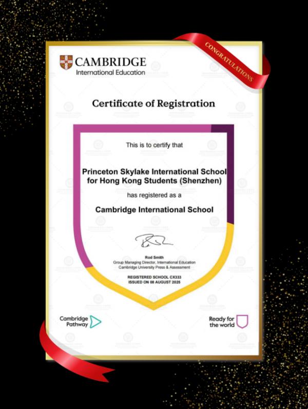 我校于2025年8月8日正式获得剑桥大学国际考评部(Cambridge International Education)认证,授权成为“剑桥国际学校”成员(学校代码为CX333),是深圳少数获得IB与剑桥双重国际认证的学校之一,亦是深圳港人子弟学校中首所实现“IB + 剑桥”双认证的学校。